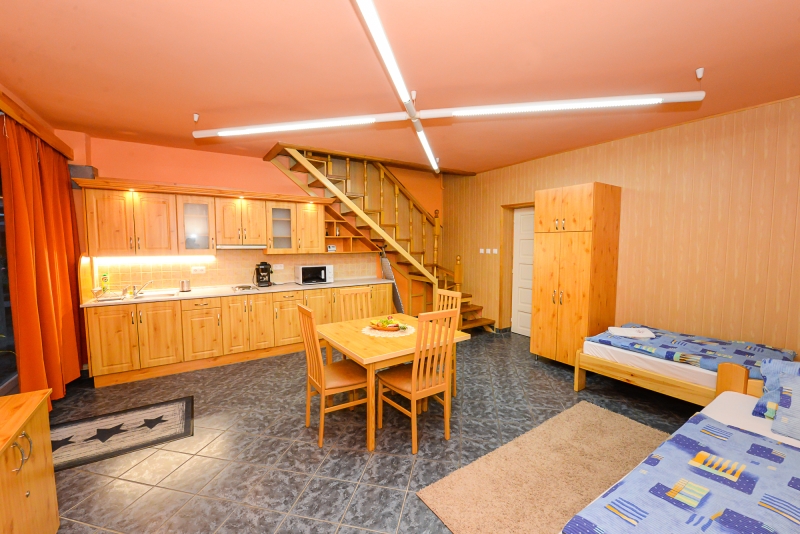Ezt a szobatípust, családok vagy baráti társaságok számára ajánljuk. A szobában 2 hálószoba található, két külön szinten, amely 2 külön légtérben helyezkedik el. A két helyiség ajtóval nincs elválasztva. A közös fürdőszoba az emeleten található, ugyan úgy, mint a külön helyiségben lévő WC. Vendégeink kényelmét az alábbi felszereltség szolgálja: síkképernyős TV és klíma (mindkét helyiségben), egyszerűen berendezett konyha, kávéfőző, hűtőszekrény, szoba széf, zuhanyzó, mosdó, WC.